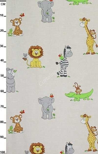Zandkleurige Afrikaanse kindergordijnen 100% katoen, zware kamerhoge kwaliteit. De olifant, neushoorn, zebra en krokodil spelen met kleine dieren. Om de gordijnen te verduisteren kan de stof worden gevoerd worden met de beige / zand voeringsstof. Ook een dekbedovertrek kan van deze stof gemaakt worden.