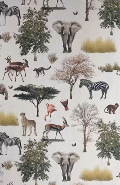 Afrika gordijnen, natuur en cultuur komen samen in deze gordijnstof. Luipaard, zebra, olifant, leeuw, antilope, neushoorn en zelfs de flamingo staat erbij. Stof is zuiver katoen van zware kwaliteit met licht linnengelijkende ondergrond. Het groen van de bomen geeft het gordijn een rustelement. Ook voor een kussen, of slaapkamergordijnen prachtig. De stof laat wel licht door dus een voering is wel aan te raden.