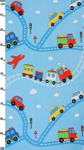 Auto`s, vrachtwagen, trein en vliegtuigen op maat gemaakte kindergordijnen. Ook super leuk als dekbed! Bijna alle kinderen zullen dit geweldig vinden om aan de muur te hebben. Een mooi kinderlijk blauw met speels getekende voertuigen. De stof is 100% katoen, daarom raden wij aan te wassen op 30°C.