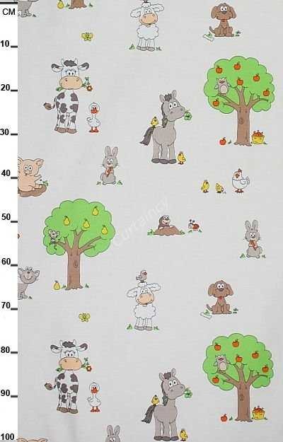 Schaap, paard, koe, varken, kat, hond, kippen, mol kindergordijnen boerderij. Dieren van de boer bij een appelboom en een perenboom. 100% gebroken witte katoen, zware soepele kwaliteit.Om de gordijnen te verduisteren gebruikt u de 100 % lichtdichte voeringsstof. Wanneer u dit niet doet zal het restlicht van de verduisteringsstof het gebroken wit van de boerderij gordijnen veranderen in lichtgrijs.