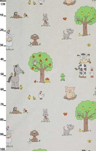 Zandkleurige Boerderij kindergordijnen, schaap, paard, koe, kat, hond, kippen en een mol spelen tussen de appelbomen en de perenbomen. 100% katoen, zware kwaliteit. Om de gordijnen te verduisteren kan de stof worden gevoerd worden met de beige / zand voeringsstof. Ook een dekbedovertrek kan van deze stof gemaakt worden.