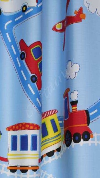 Auto`s, treinen en vliegtuigen deze lichtblauwe kindergordijnen zijn kamerhoog. De stof is satijn gebonden waardoor de stof heel glad en soepel is maar ook heel sterk omdat hij strak gebonden is. De stof kunt u gebruiken voor zowel gordijnen in de kinderkamer, een dekbed en zelfs een speelkleed. Op de stof staan auto's en treinen op een speelse manier afgebeeld op een hemelblauwe achtergrond met wolken. De auto's rijden over wegen die elkaar kruisen en de treinen rijden over spoorwegen die elkaar kruisen. Bij deze stof is veel gebruik gemaakt van primaire kleuren, perfect voor kleine kinderen. De stof is gemaakt van 100% katoen en is wasbaar op 30°C. Als plooiadvies raden wij een enkele plooi aan.